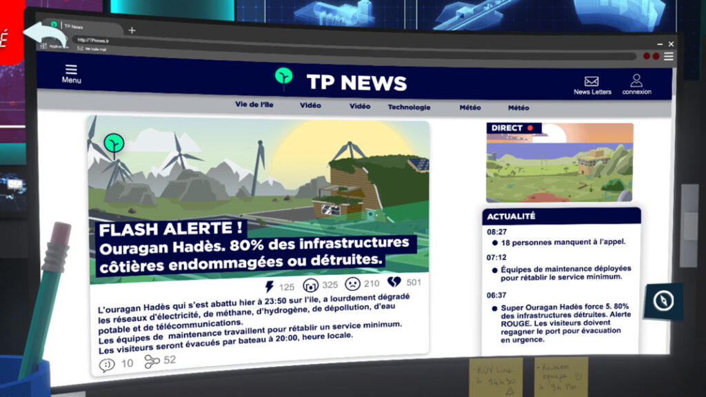 L’utilisateur évolue dans un environnement dévasté et doit reconstruire progressivement les infrastructures essentielles de l’île : routes, ponts, réseaux d’eau, énergie, traitement des eaux, etc. Chaque défi nécessite de s’informer sur les métiers, les compétences mobilisées, les engins utilisés et les infrastructures concernées.