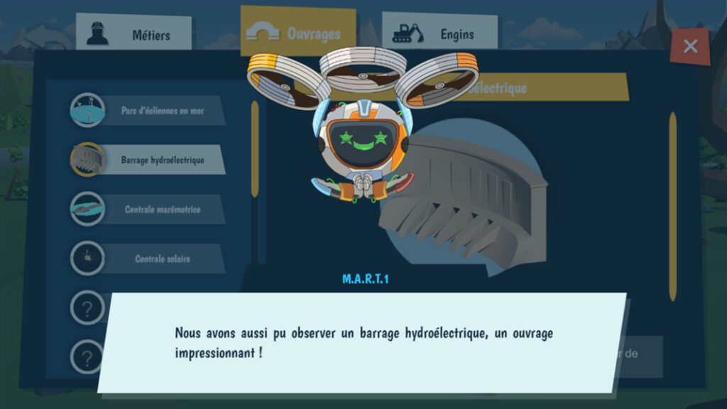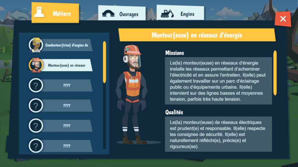 Au fil de sa progression, le joueur débloque des ressources pédagogiques (fiches métiers, engins, infrastructures) qui font écho aux missions réelles des professionnels des Travaux Publics. Le dispositif met ainsi l’accent sur la compréhension des rôles, la complémentarité des métiers et les enjeux environnementaux associés.