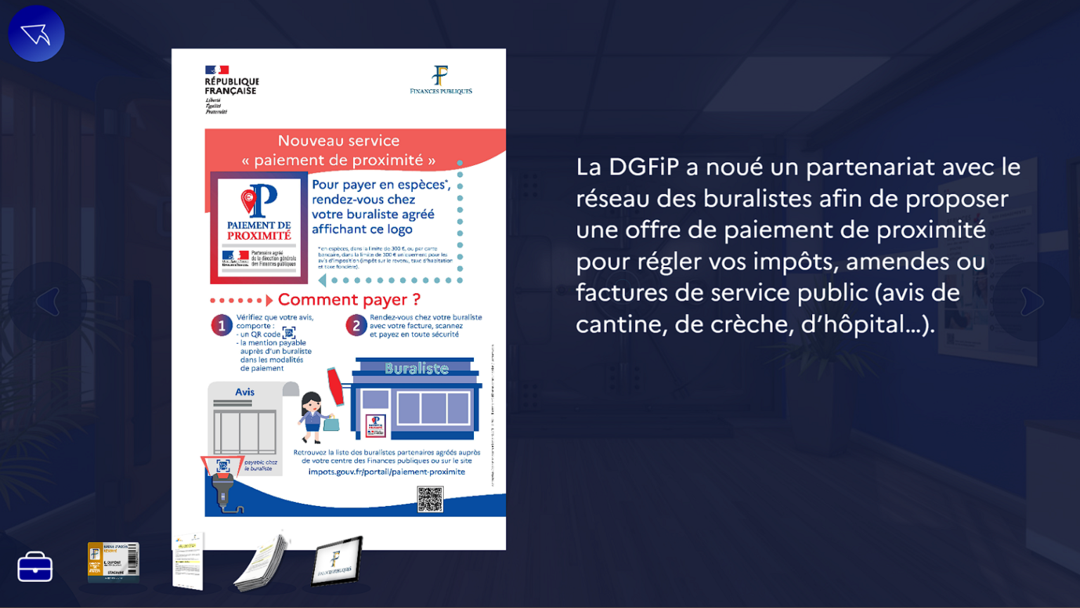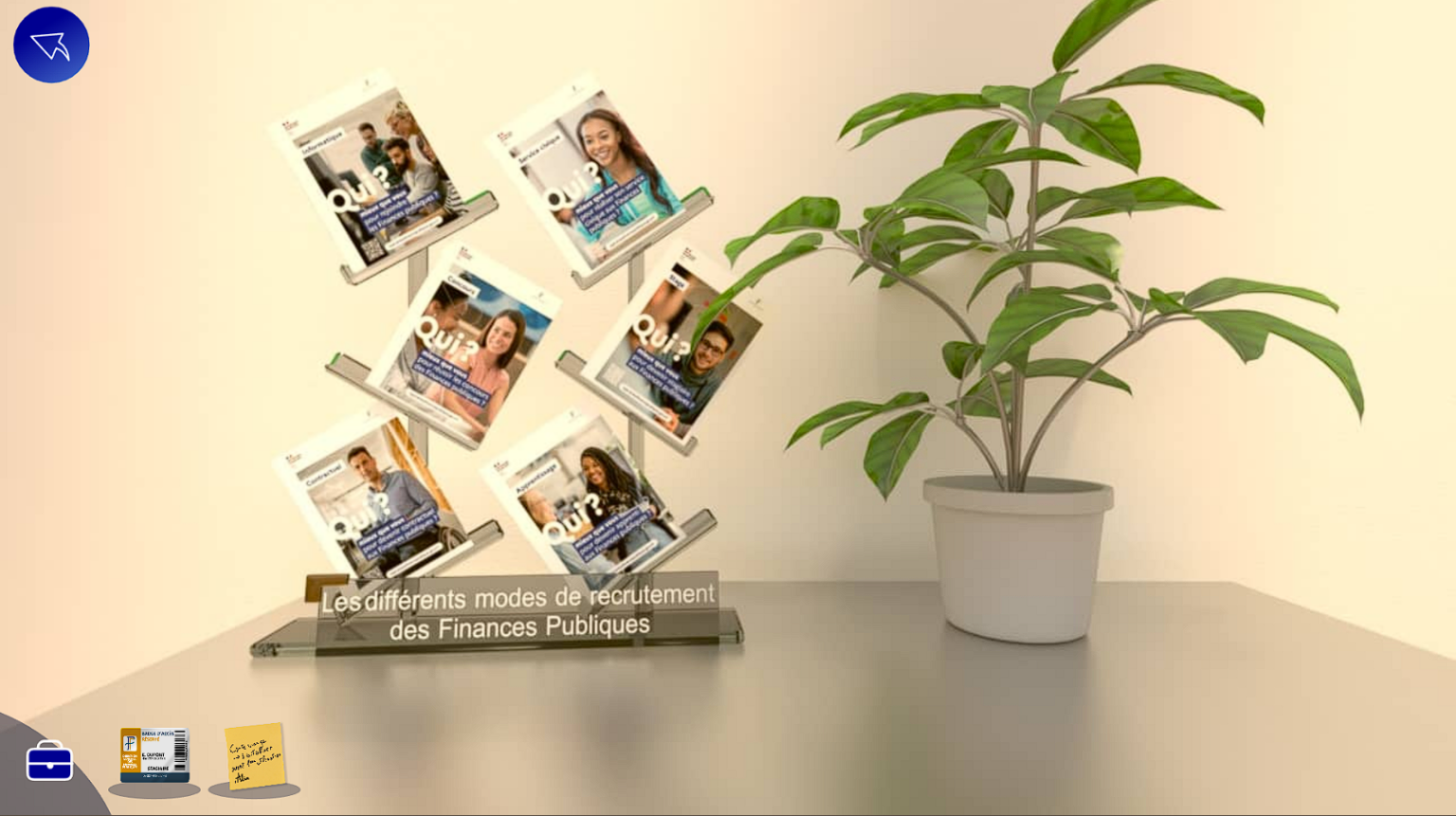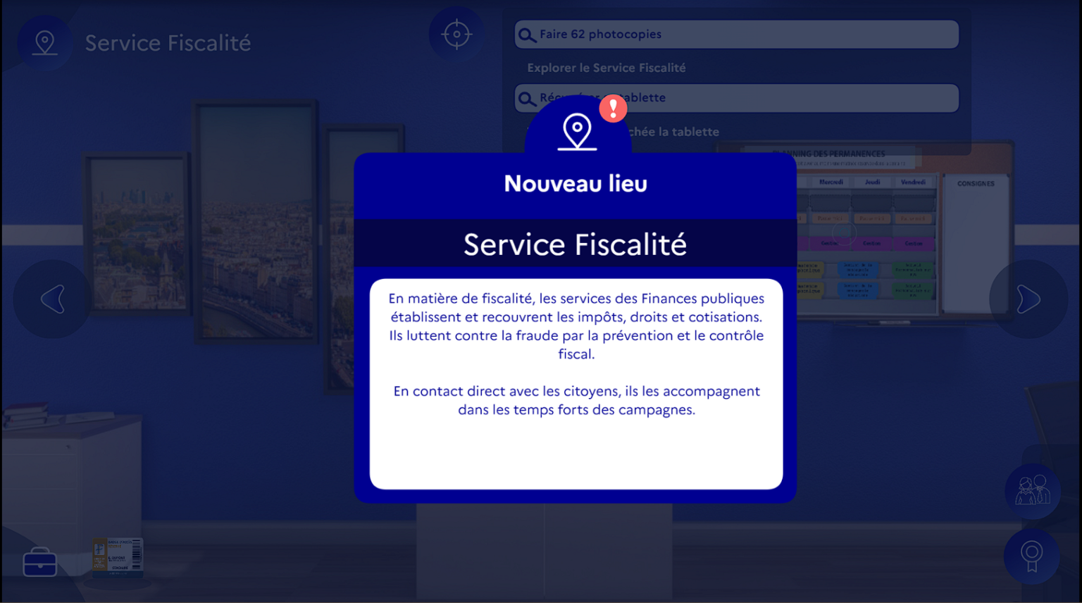 L’utilisateur explore les différents services d’une agence et interagit avec les éléments de son environnement pour résoudre des énigmes. Ces interactions lui permettent de collecter des indices et objets qui font écho aux missions, valeurs et chiffres clés de la DGFiP. Le dispositif met ainsi l’accent sur la curiosité et l’observation : en parcourant les espaces, le joueur découvre les principales catégories de métiers (gestion publique, informatique, finances, etc.) et les liens entre leurs missions.
