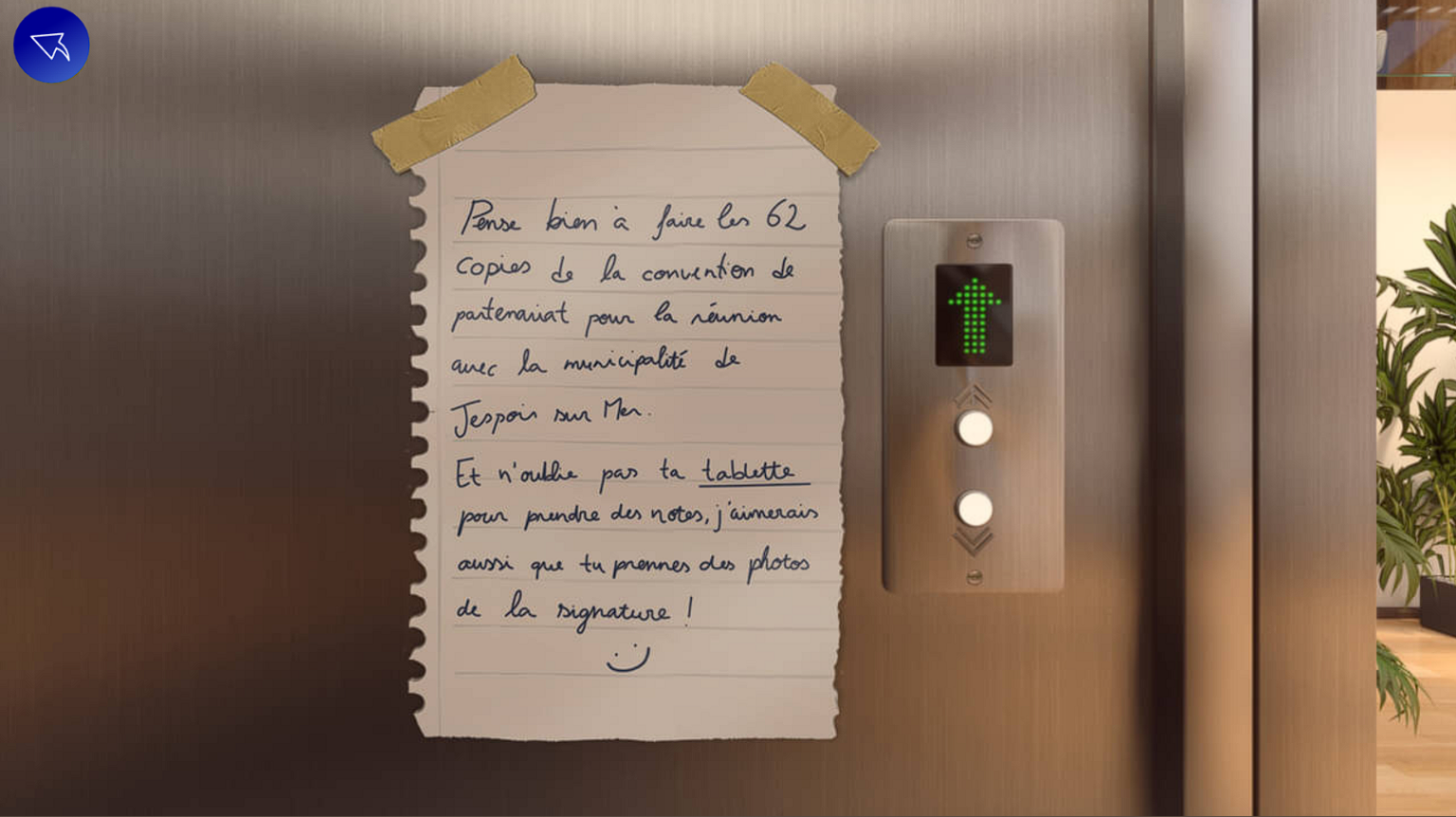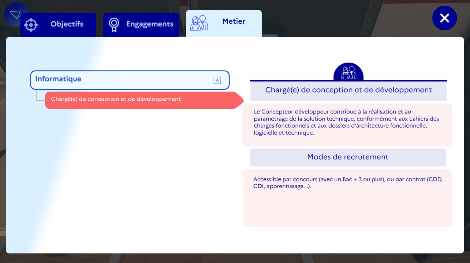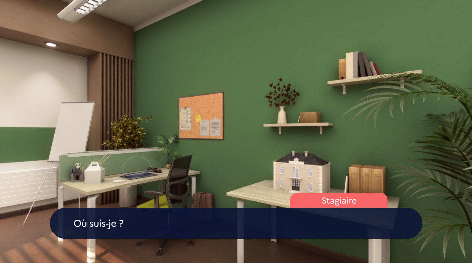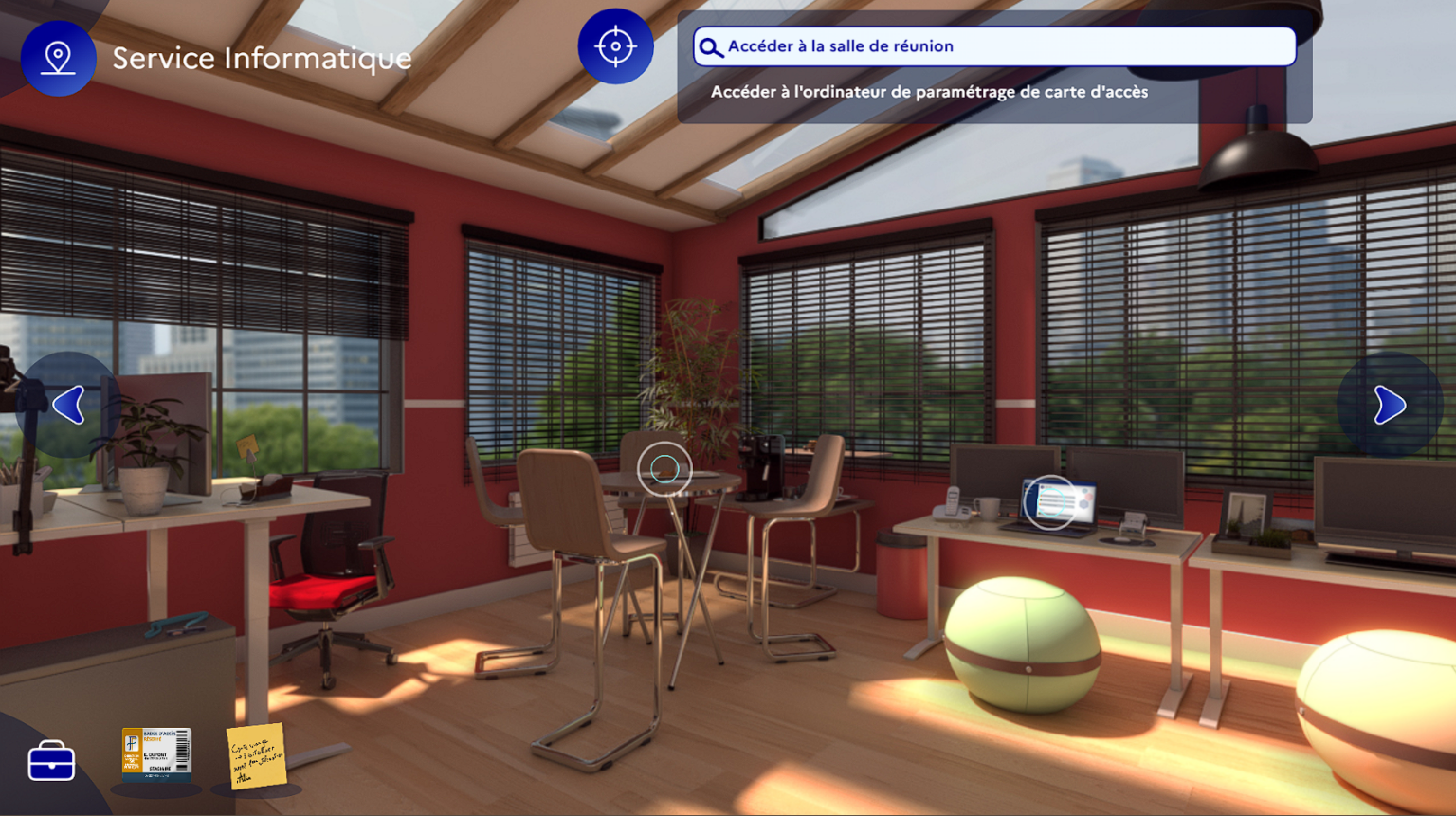 L’utilisateur explore les différents services d’une agence et interagit avec les éléments de son environnement pour résoudre des énigmes. Ces interactions lui permettent de collecter des indices et objets qui font écho aux missions, valeurs et chiffres clés de la DGFiP. Le dispositif met ainsi l’accent sur la curiosité et l’observation : en parcourant les espaces, le joueur découvre les principales catégories de métiers (gestion publique, informatique, finances, etc.) et les liens entre leurs missions.