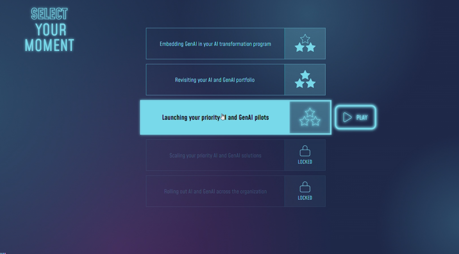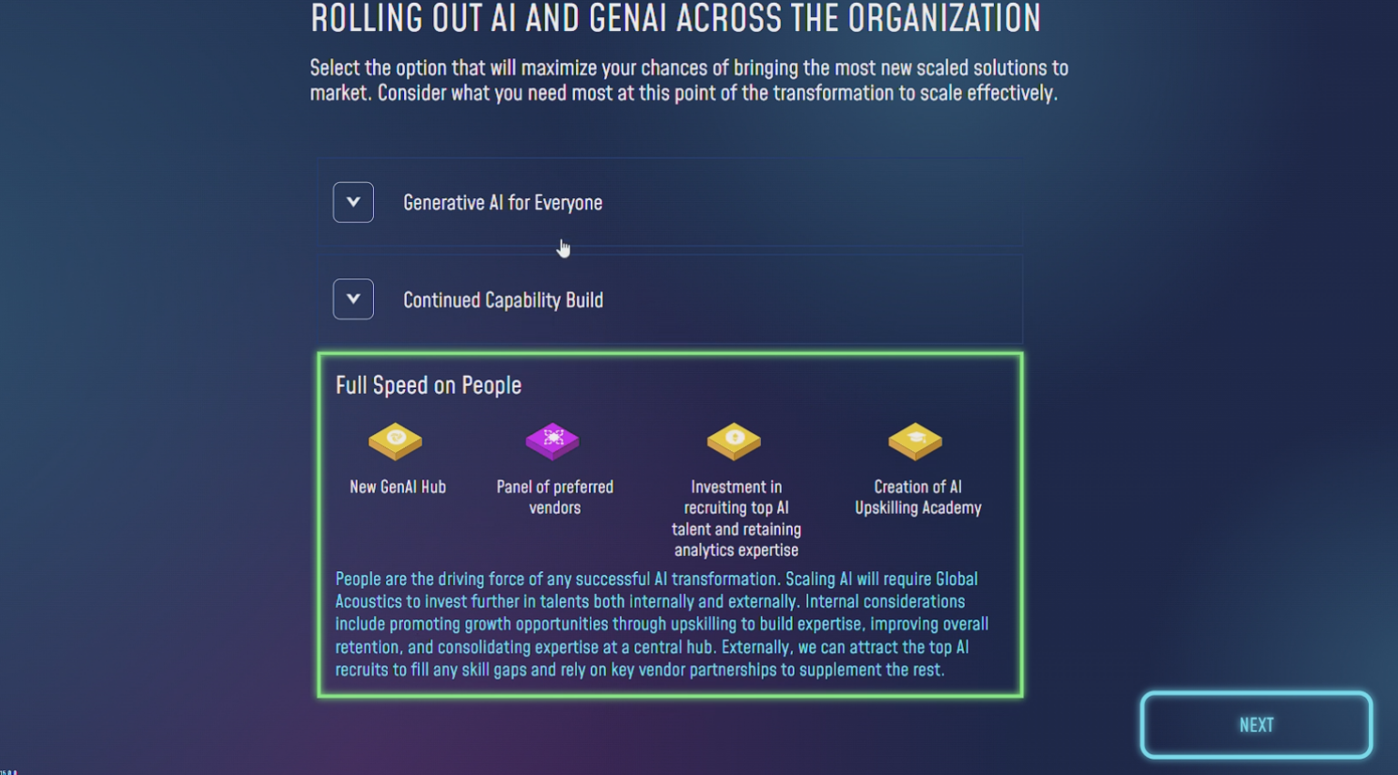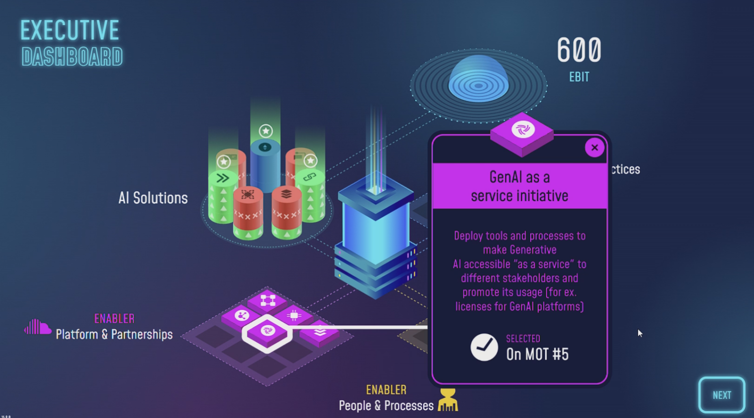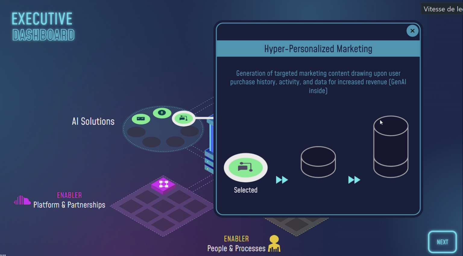 L’utilisateur est amené à prendre des décisions stratégiques tout au long du déploiement d’une stratégie data : génération et structuration des données, choix technologiques, intégration de solutions d’intelligence artificielle, allocation budgétaire et conduite du changement. Chaque décision influence l’évolution de l’entreprise et ses performances.