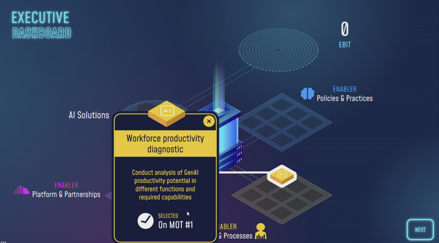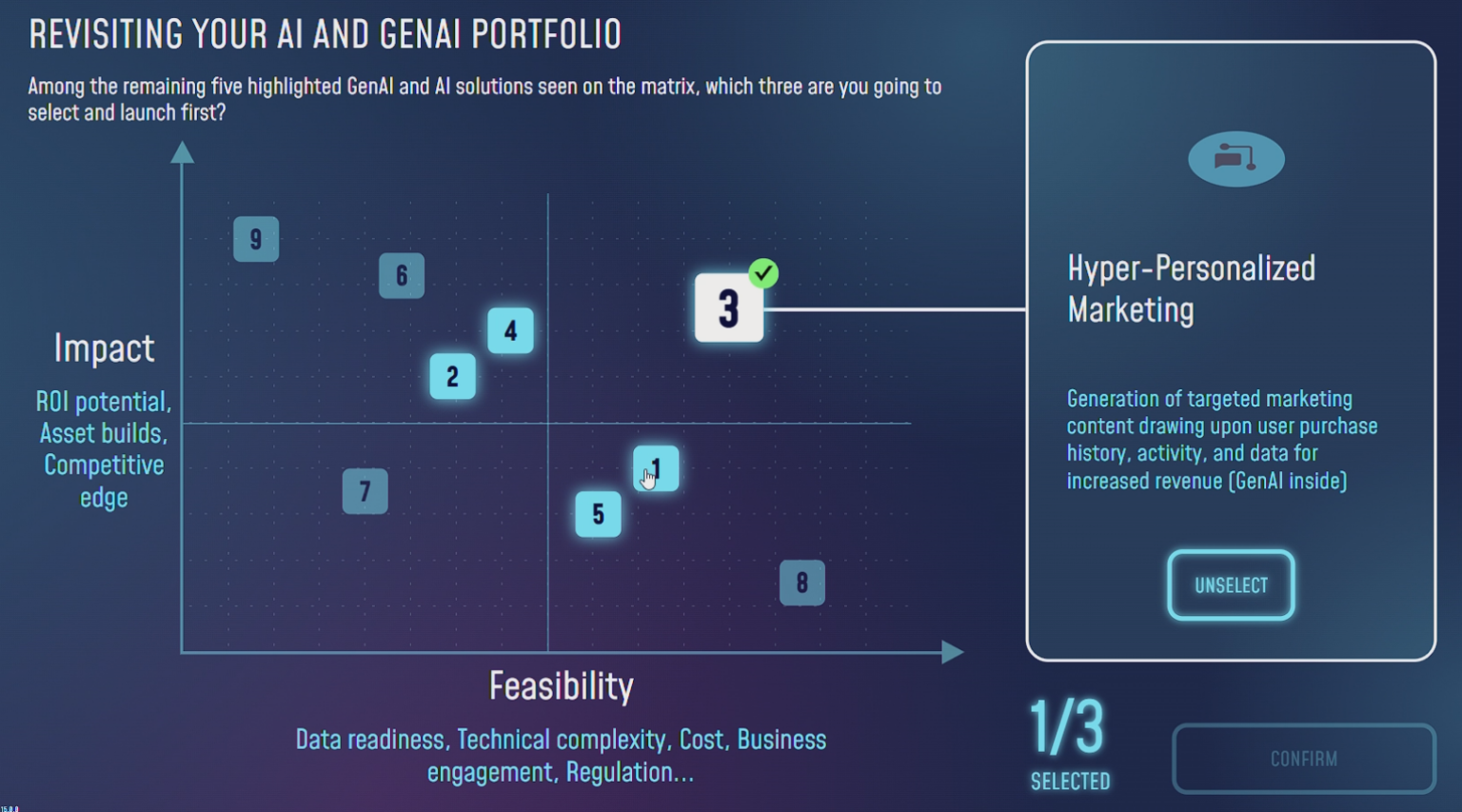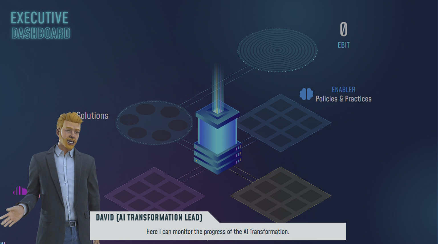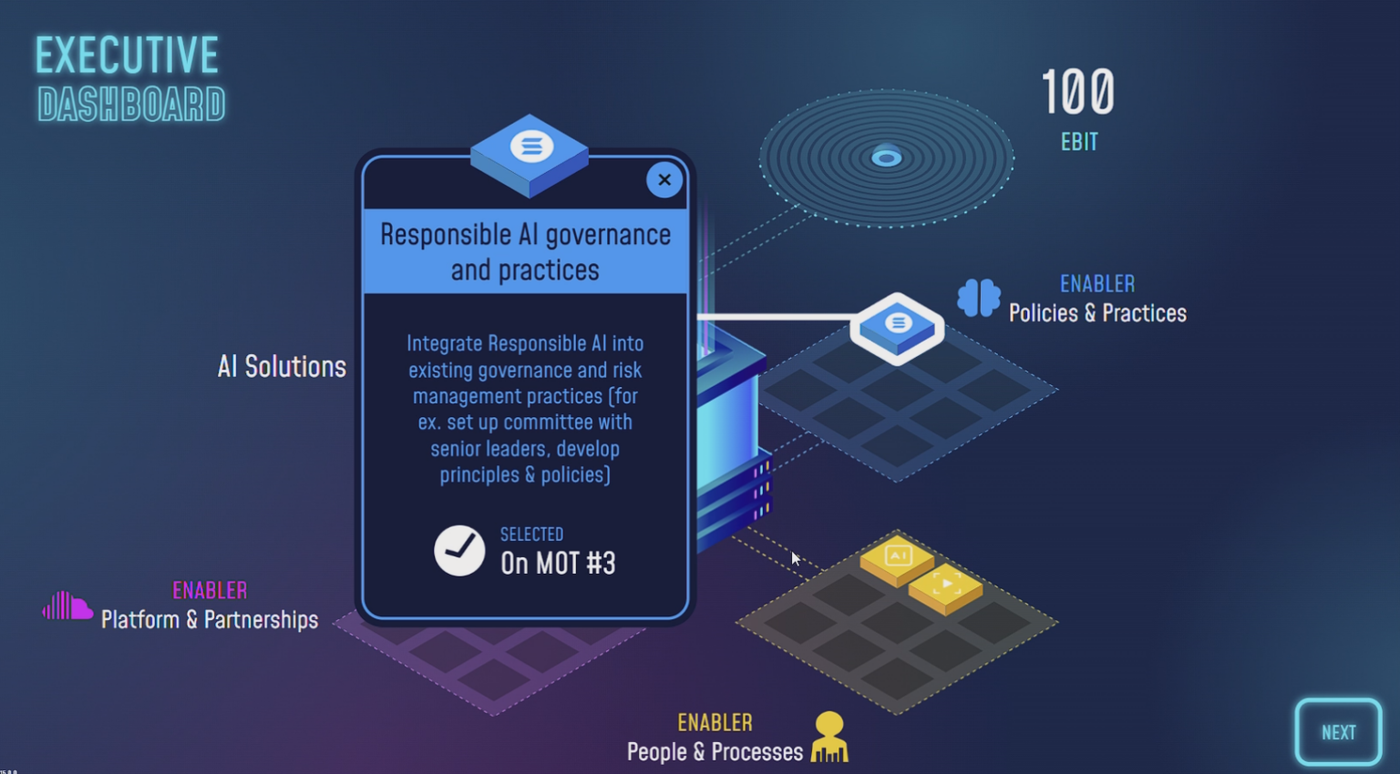 L’utilisateur est amené à prendre des décisions stratégiques tout au long du déploiement d’une stratégie data : génération et structuration des données, choix technologiques, intégration de solutions d’intelligence artificielle, allocation budgétaire et conduite du changement. Chaque décision influence l’évolution de l’entreprise et ses performances.